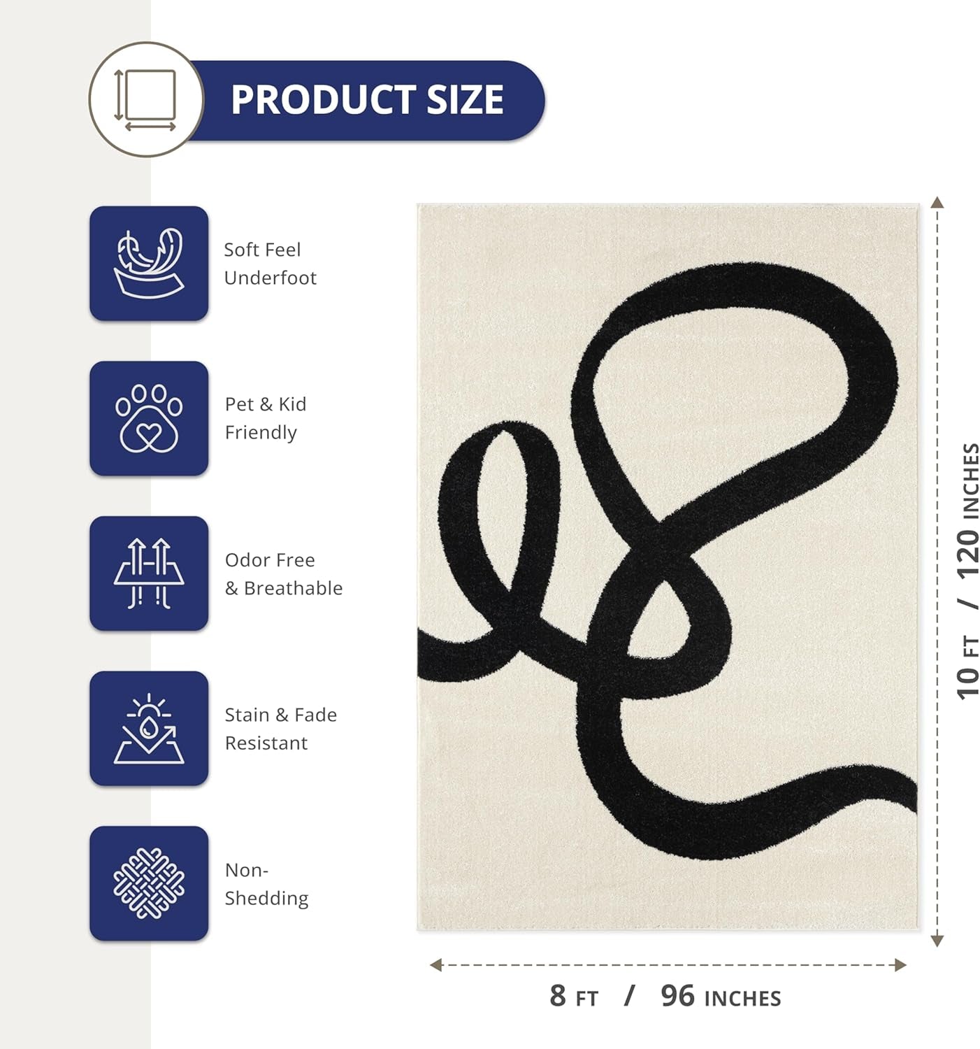 Ground your space with this modern area rug featuring a curved abstract design in beige and black. Its soft, power-loomed surface is made to handle high-traffic areas while adding a bold, contemporary focal point to your living room, dining area, or bedroom.